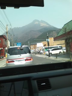 車にのって湯布院観光です。お昼を食べて、由布岳をバックにぱちり。