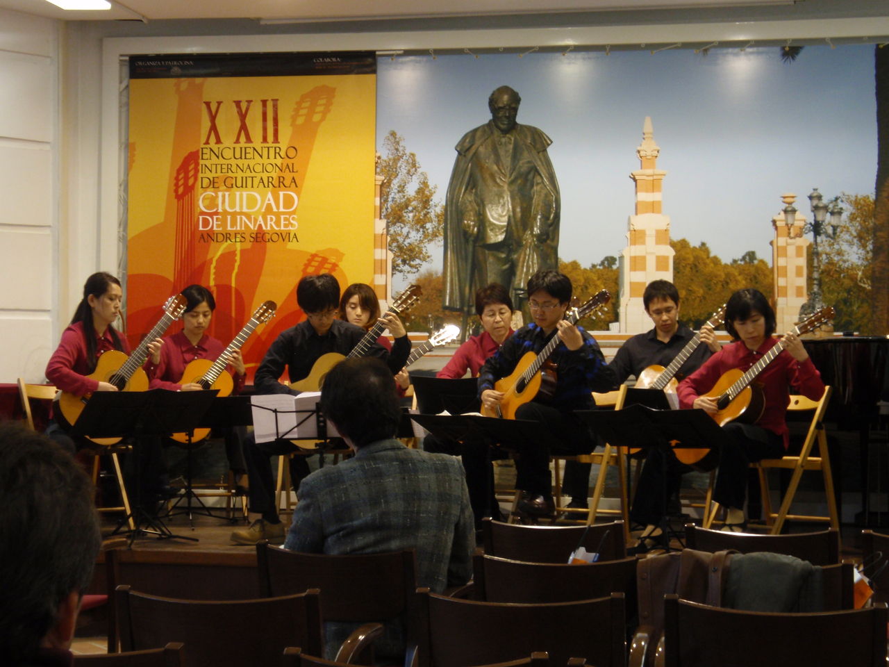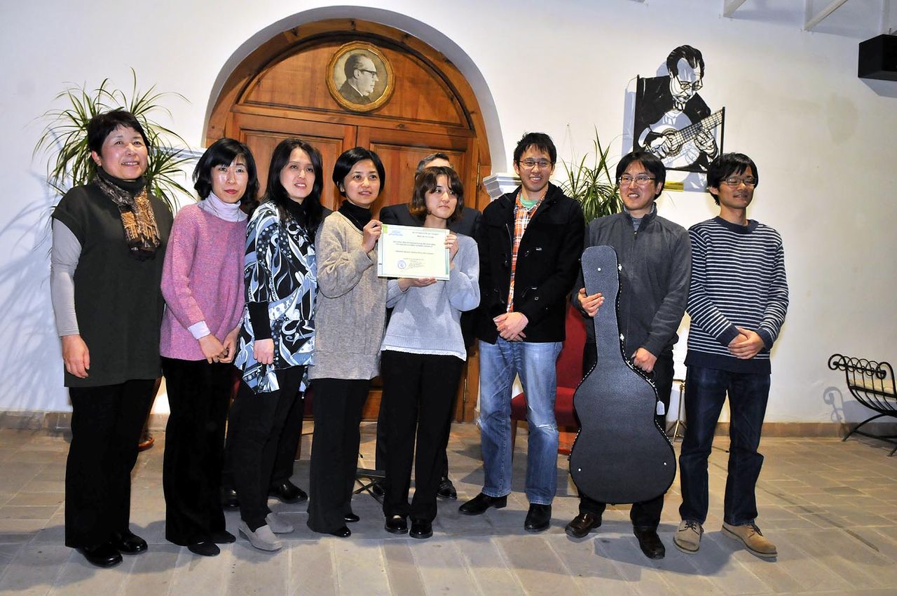 2013年11月22日〜24日にかけて開催されたリナーレス市アンドレス・セゴビア国際ギターコンクールの室内楽部門で当教室で結成されている「リオ・リコ・ギターアンサンブル」が一位を受賞いたしました。以下は授賞式の様子。賞品のギター&賞状を持っていますが、スペイン語の分からないメンバーがほとんどなので、実は「一位」をもらったのだ!と気づいたのは、表彰式後のことでした 苦笑。