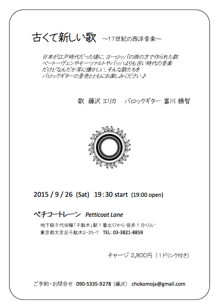 会場となった千駄木のペチコートレーンもとっても素敵なライブバーでした!会場の響きもバロックギターと歌にはちょうどよく、また演奏したい場所です。