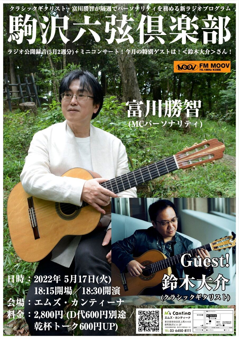 クラシックギタリスト・富川勝智が隔週でパーソナリティを務める新ラジオプログラム<駒沢六弦倶楽部 (神戸コミュニティFM「FM MOOV」2022年4月スタート)。その公開録音(6月2週分)とミニコンサートの二本立てイベントを開催いたします。今月のゲストは!<鈴木大介>さん!終演後にゲストを交えた乾杯トークもあります。皆様のご来場御待ちしています!