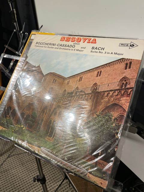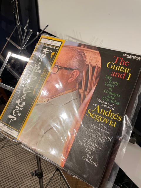 セゴビア「ギターと私」:これに収録されている基礎練習がこのまえ池田慎司さんと岩崎慎一さんとのコンサート後の飲みで話題になりました。このレコードはA面がセゴビアが自分の若い頃のことを語るという内容で、そこに基礎練習が収録されているのです。その音色はオンマイク気味で非常にリアル。弦をブッシュする感覚やスラーの指板の音などがリアルに。実はこのB面に収められている「練習曲」がとてもとても名演なのですが、イベントではかけませんでした。時間の関係で。