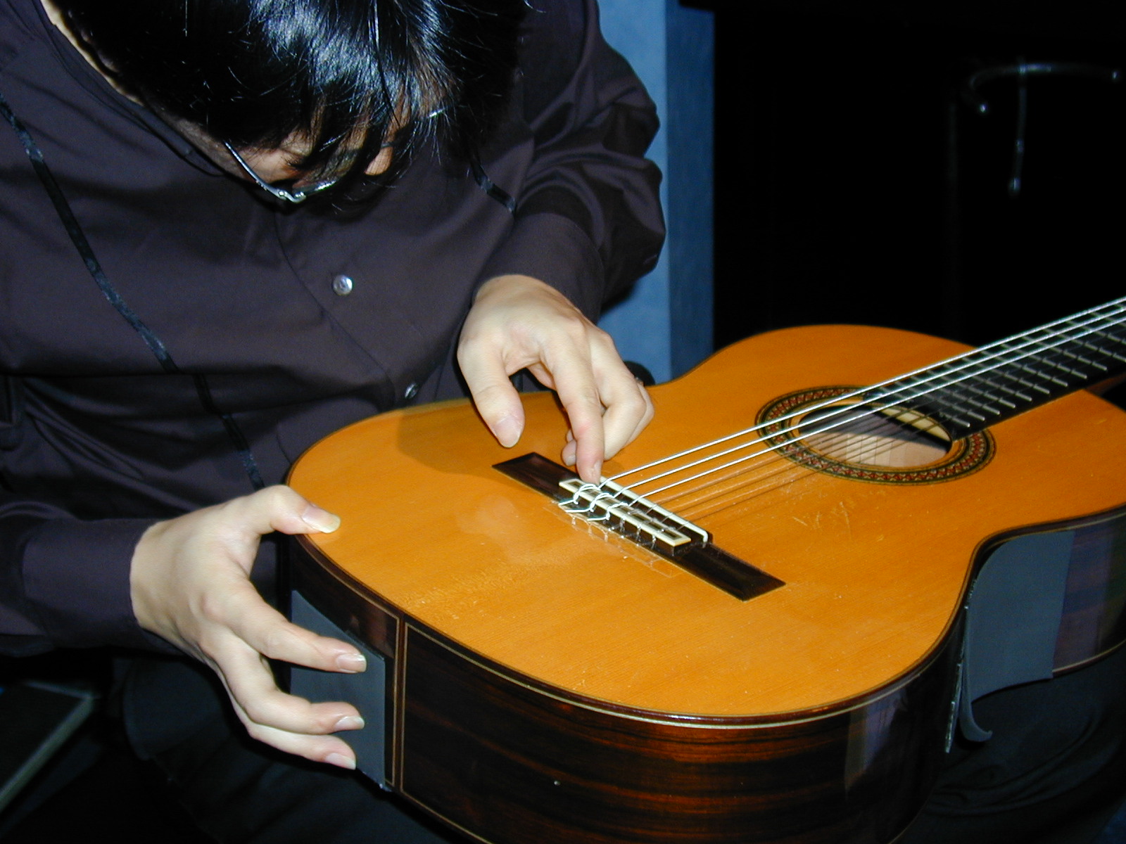 ブリッジ部分の穴から骨棒へ弦がダイレクトにはいっているかどうかチェック中。