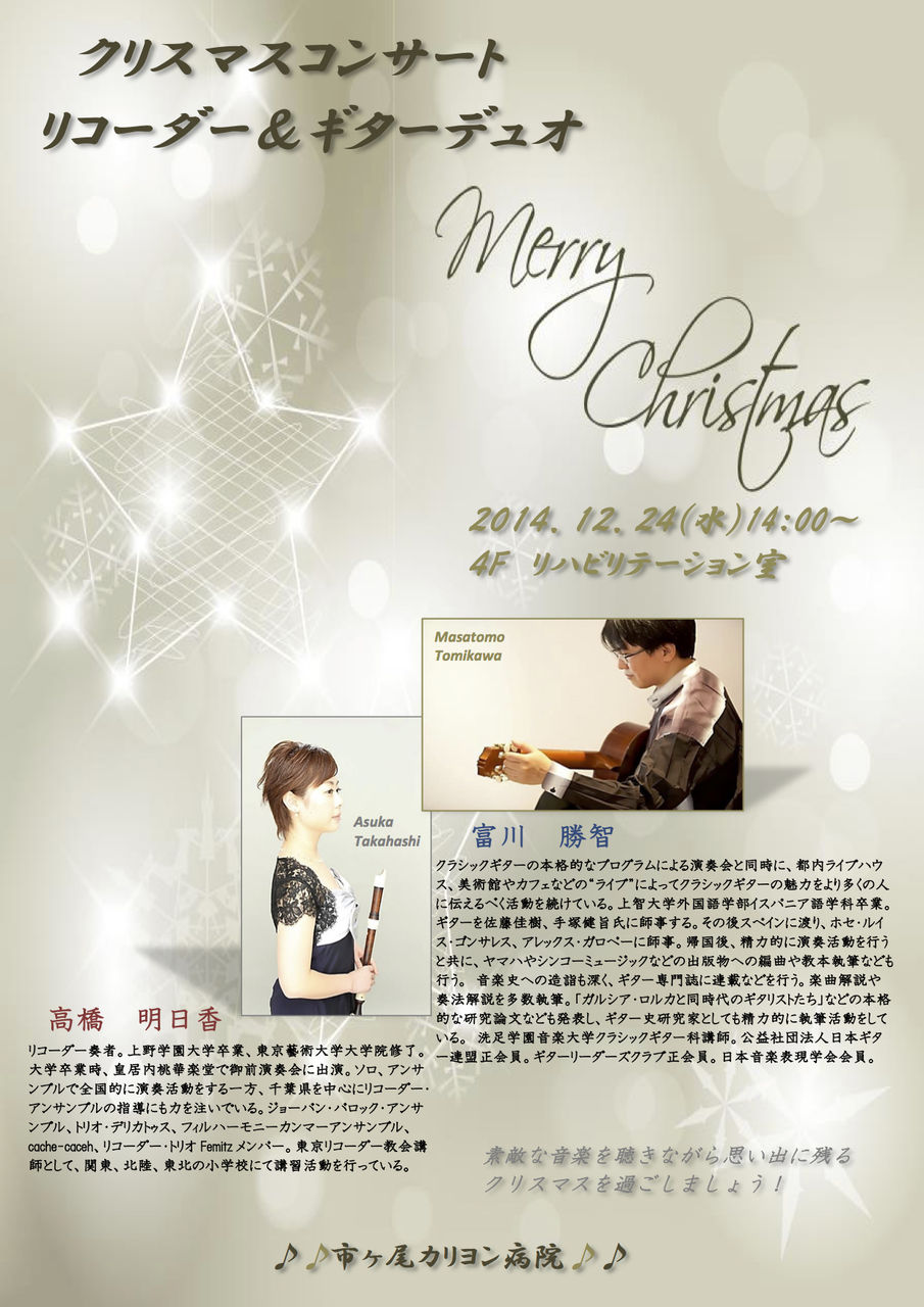 12月22日 市が尾カリヨン病院にてクリスマスコンサートがありました。ここ数年ずっと呼んでいただいております。今年もリコーダー奏者の高橋明日香さんと演奏してきました。