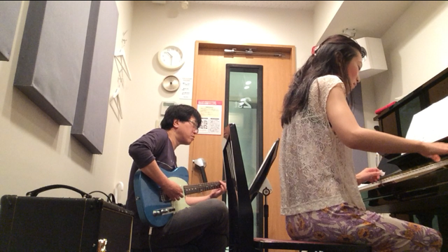 ニャタリ「民謡組曲」:ハダメス・ニャタリはポピュラーミュージックとクラシックにまたがって活躍した作曲家です。この曲はエレキギターとピアノのために書かれた曲です。富川がエレキギターを担当!(富川&青島)