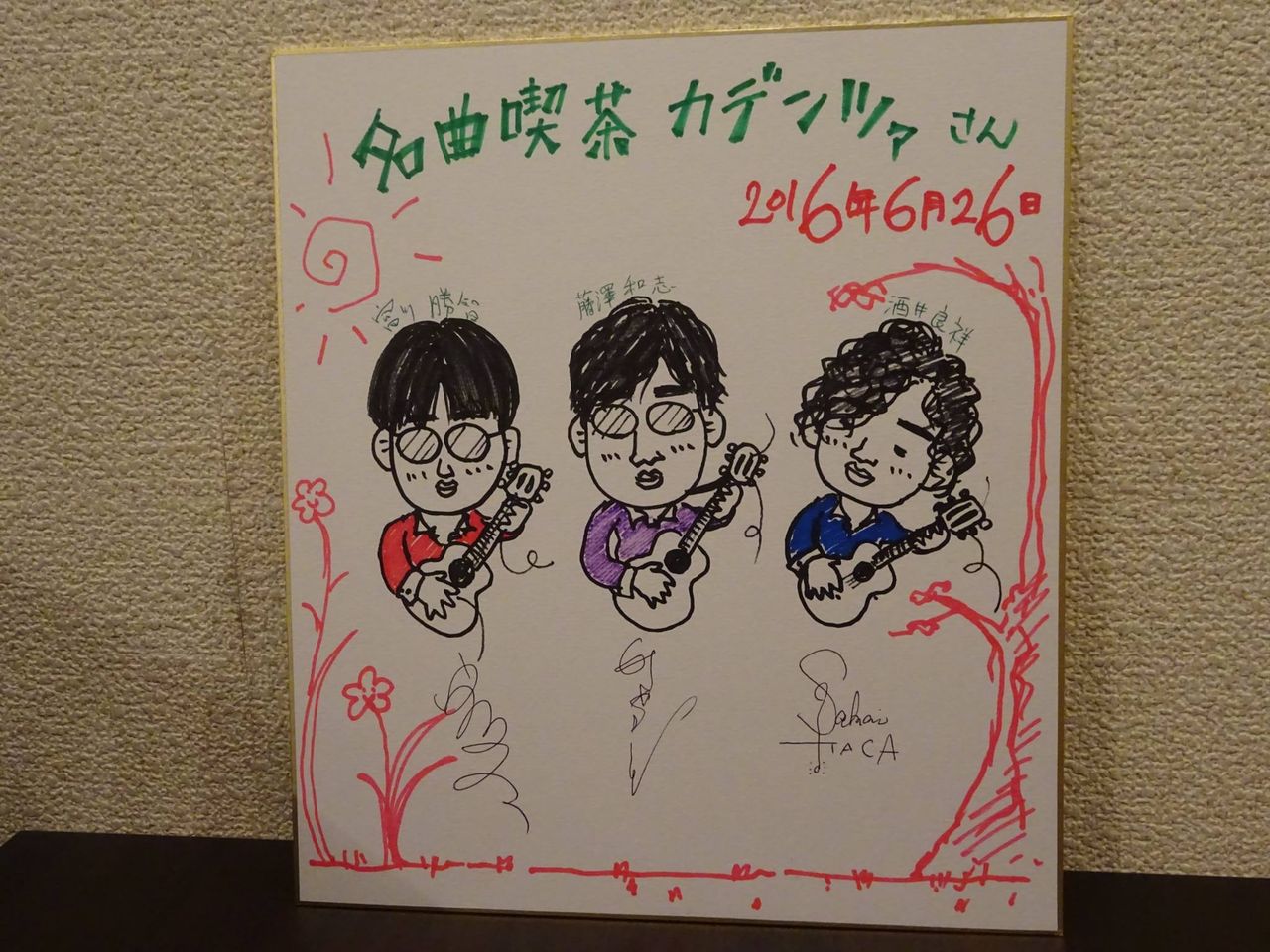 名曲喫茶カデンツァでは出演者は色紙を書くことになっております。イラストが得意な酒井くんにかいてもらいました!