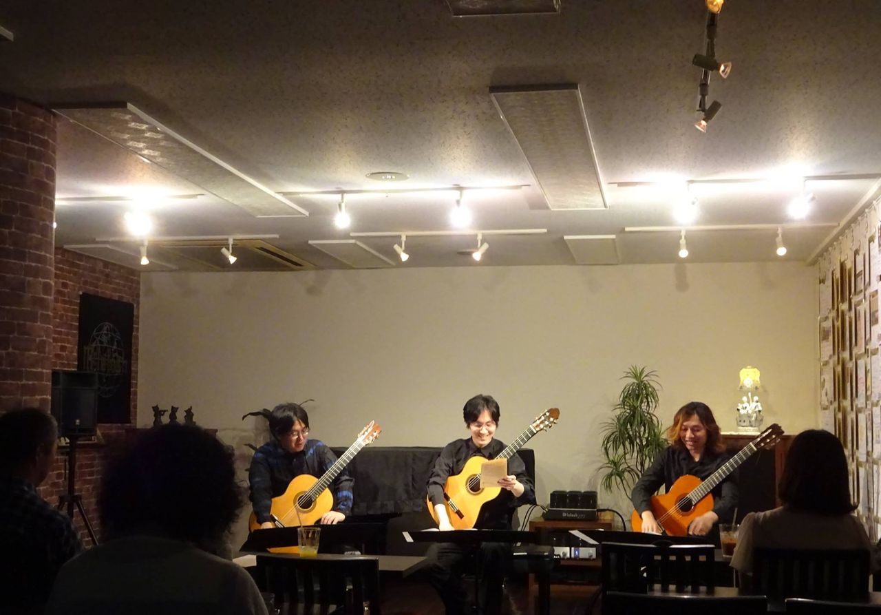 5/12の鎌倉芸術館での「クラシックギタートリオコンサート」に引き続き、東京・本郷三丁目「名曲喫茶カデンツァ」にて同じメンバーで演奏会を行いました。