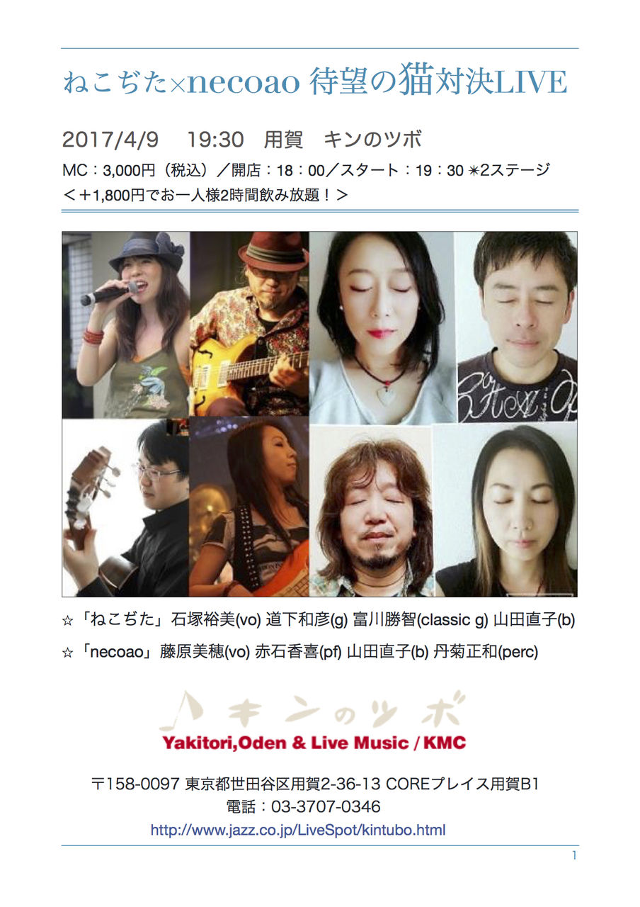 4/9にライブをします。「日本を代表する二大猫バンド」(非公認)の初共演です。