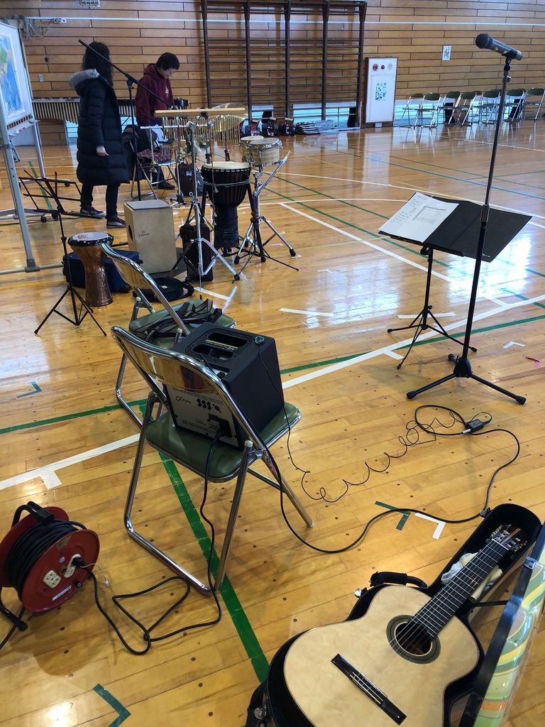 器楽や合唱に力をいれている小学校なのです。そこにプロ奏者として、パーカッションの安井希久子をバンマスに、リコーダー高橋明日香とギター僕とで行ってきたわけです。